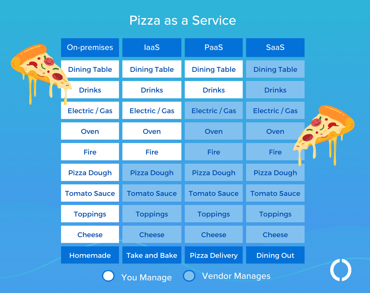 «Pizza as a Service analogy» Pizza as a Service - On Premise, IaaS, PaaS and SaaS terms simply explained using a pizza menu and its different ways of preparation Example: App Engine; Function as a Service — You go to a pizzeria with some friends